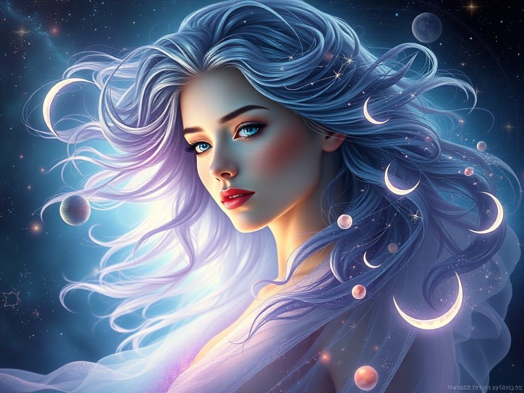 This image features a serene, ethereal woman with a luminous aura, surrounded by swirling galaxies, starry skies, and cosmic dust. Her delicate, glittering gown is woven from stardust, adorned with pulsing constellations, and she's set against a vast, shimmering expanse of the cosmos, evoking a dreamlike...