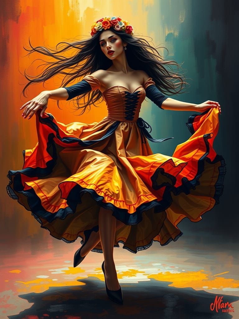 This image captures a gothic woman's energetic dance, set against a rich, warm backdrop with deep shadows, evoking the works of Degas, Schiele, and Waterhouse. A kaleidoscopic dreamscape of sound and colour, bursting with movement and texture.
