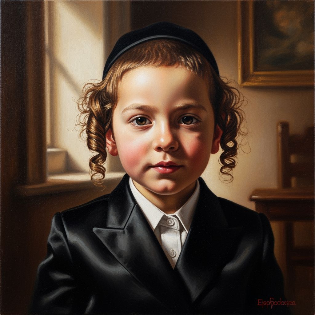 A realistic oil painting shows a young Hasidic boy with peyot and traditional attire, illuminated by dramatic chiaroscuro lighting. The portrait emphasizes warmth and depth with rich textures and a serene expression.