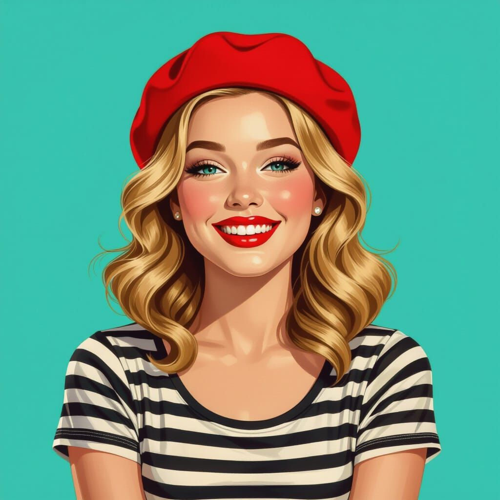 This image shows a smiling young woman in a red beret and striped shirt, styled in a retro 1940s pin-up aesthetic. The portrait features detailed facial features, bold lipstick, and a teal backdrop.