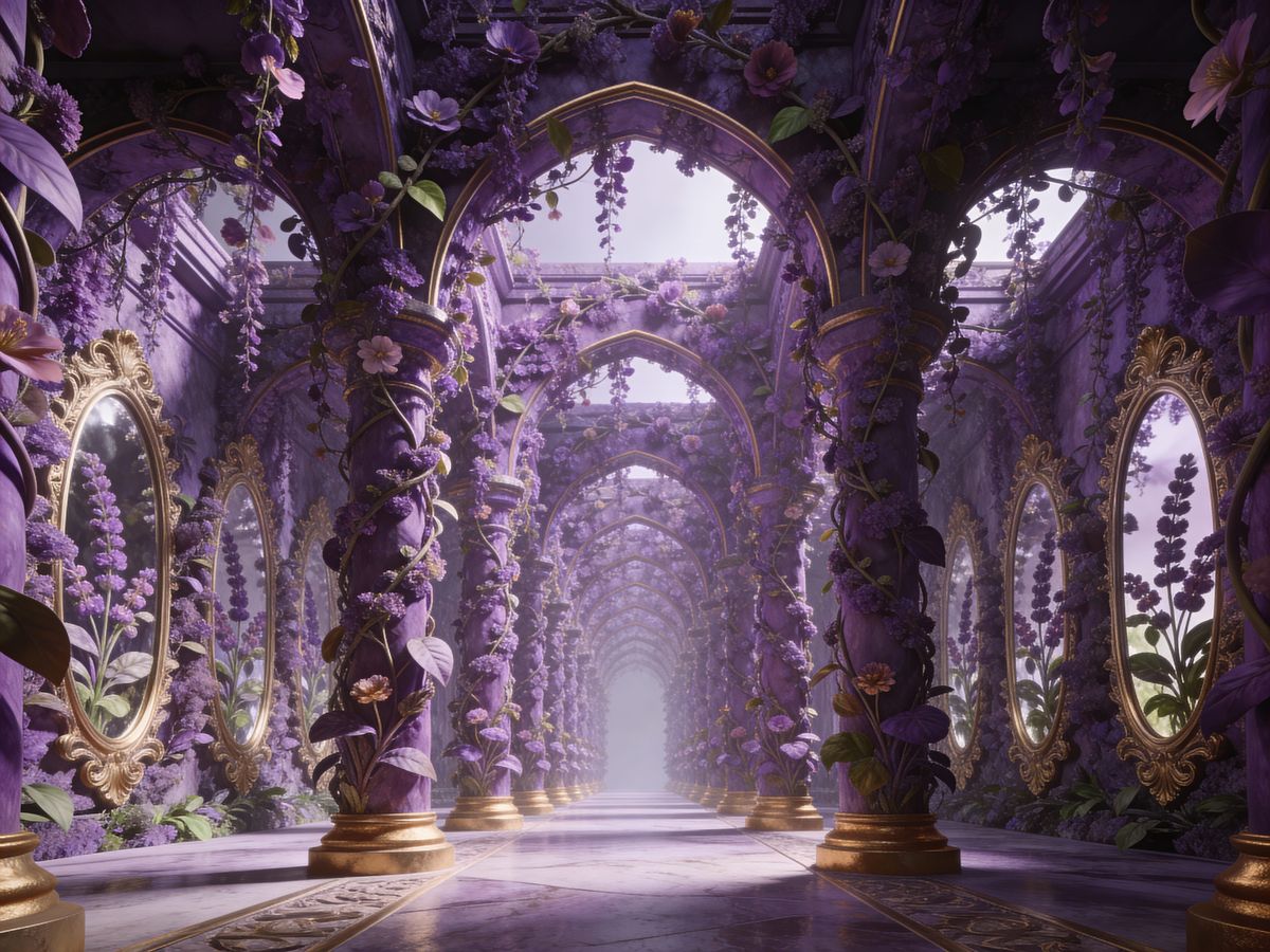 This image depicts a grand, symmetrical hall constructed from lush purple flora, featuring vine arches and flower columns. It has ornate plant mirrors and a surreal, majestic atmosphere with clear, cinematic lighting.