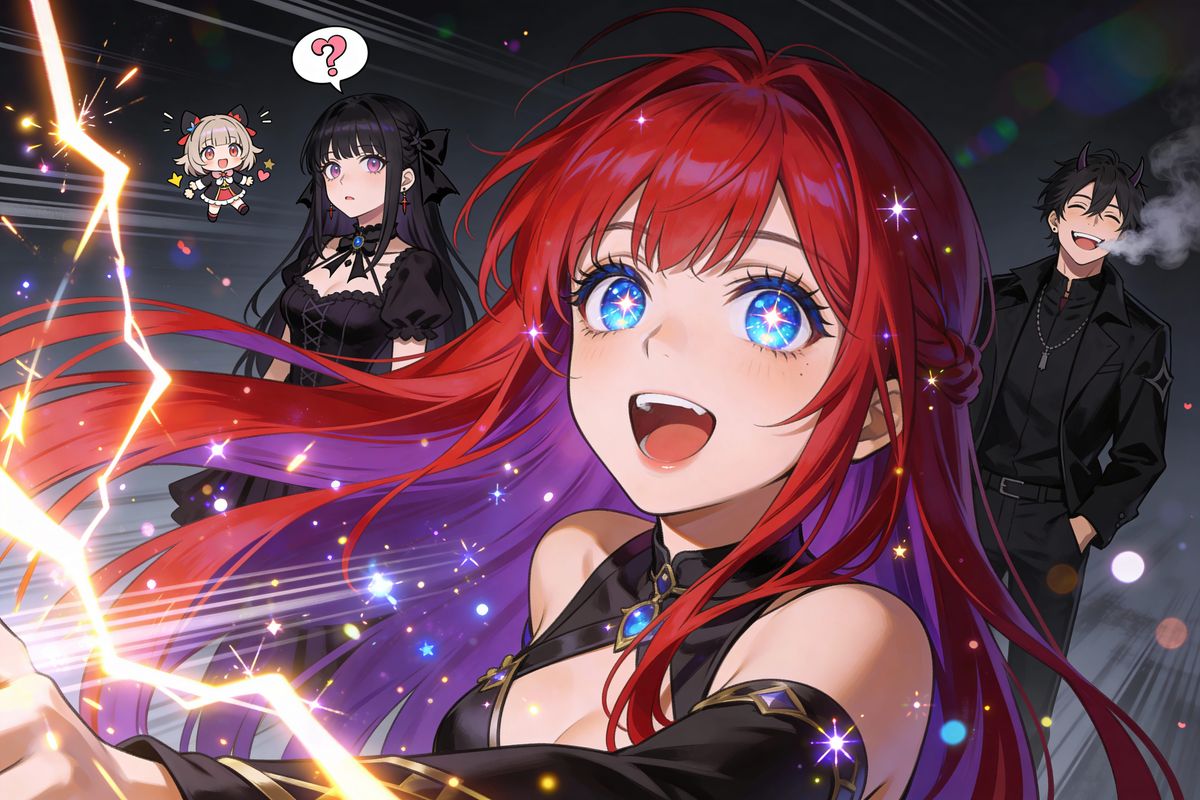 This 3D concept art shows a cheerful anime character with vibrant red and purple hair, wide blue eyes, and magical particles. Features dynamic lighting and whimsical, detailed textures.