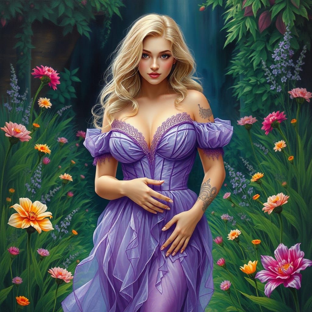 A digital painting of a beautiful, curvy blonde woman in an elaborate purple dress. She stands in a lush palace garden filled with vibrant green grass, whimsical plants, and sumptuous flowers.