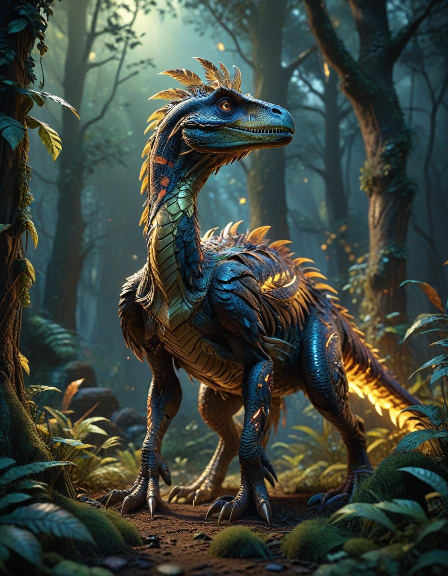 A regal velociraptor stands amidst an ancient, mystical forest, its iridescent feathers glistening in the warm, golden light. Intricate details and lush colors create a dreamlike atmosphere, reminiscent of fantasy concept art.