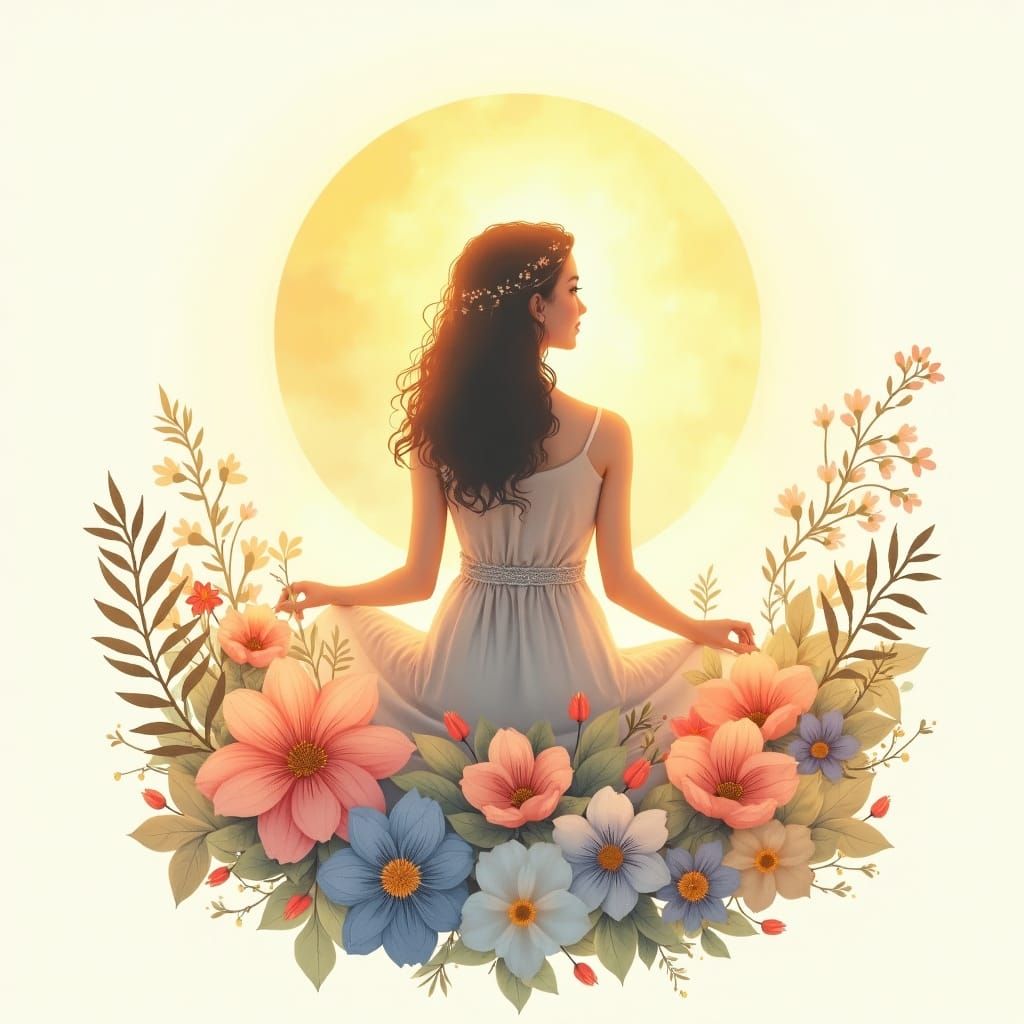 A serene image shows a woman's silhouette encircled by a radiant moon, blossoms, and warm light, capturing a spiritual moment. The artwork exhibits a watercolor aesthetic with gentle pastel hues.