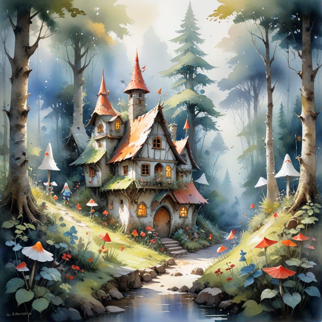 A vibrant gnome village nestled deep within an enchanted forest. The image showcases stylized watercolor techniques with expressive linework and ethereal stylization, creating a mesmerizing and beautiful scene.