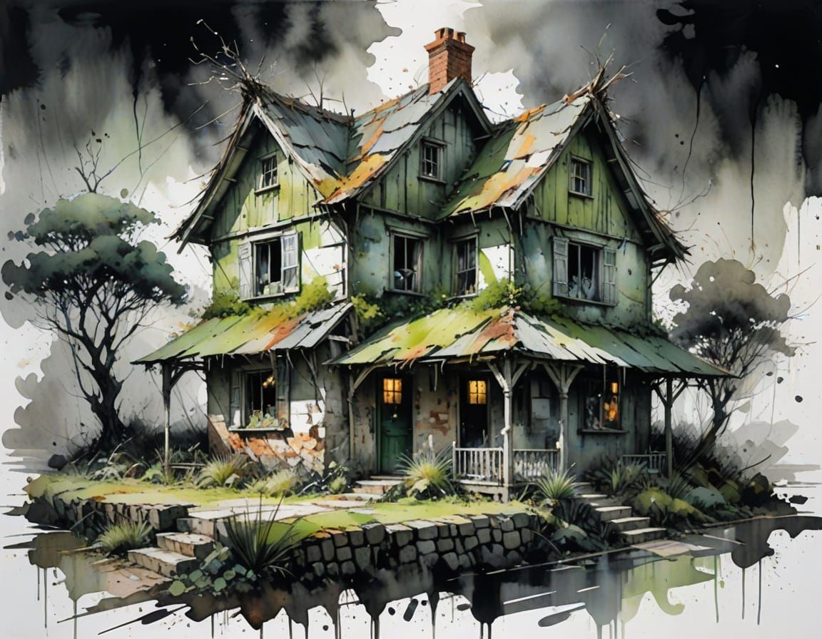 A vintage crooked cottage rendered in delicate watercolor. The image showcases a fusion of chaos and beauty in an ethereal, cinematic style, surrounded by splashy black space.