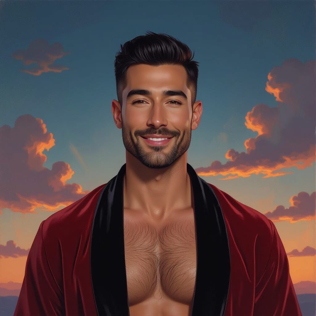 This image shows a handsome man in a red velvet robe, smiling warmly. The portrait is rendered in an impressionistic style, with thick brushstrokes and warm, vibrant lighting.