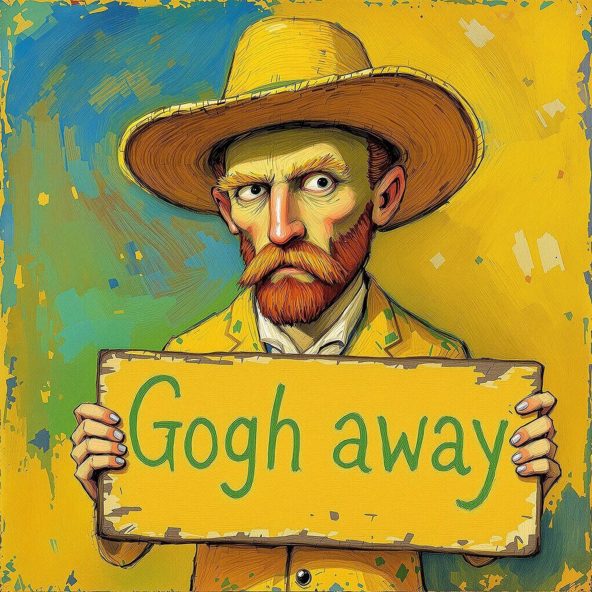 This image shows Van Gogh in a yellow sundress holding a sign that says "Gogh away". The artwork is reminiscent of Paul Klee with expressive brushstrokes and layered textures.