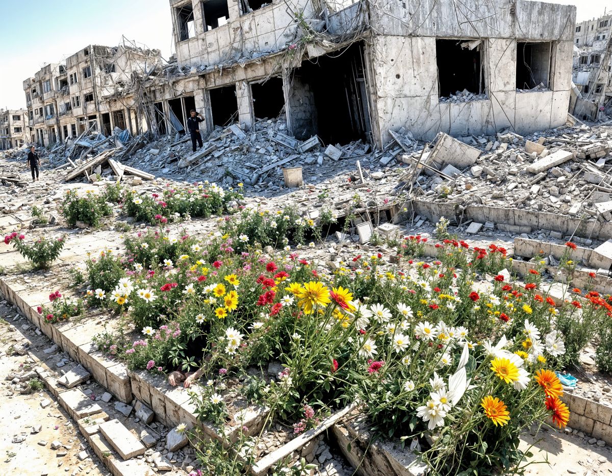 This image shows a few flowers blooming amidst the devastation in Gaza. It is a heartbreaking yet heartening depiction of resilience and hope in the face of suffering.