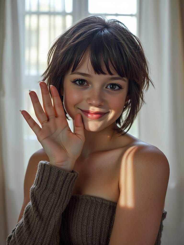 This image shows a whimsical young girl in a charming atelier setting, surrounded by sunbeams and shimmering dust particles. Her big, wide eyes sparkle with mischief, and her puffy lips are gently shut as she looks directly at the viewer.