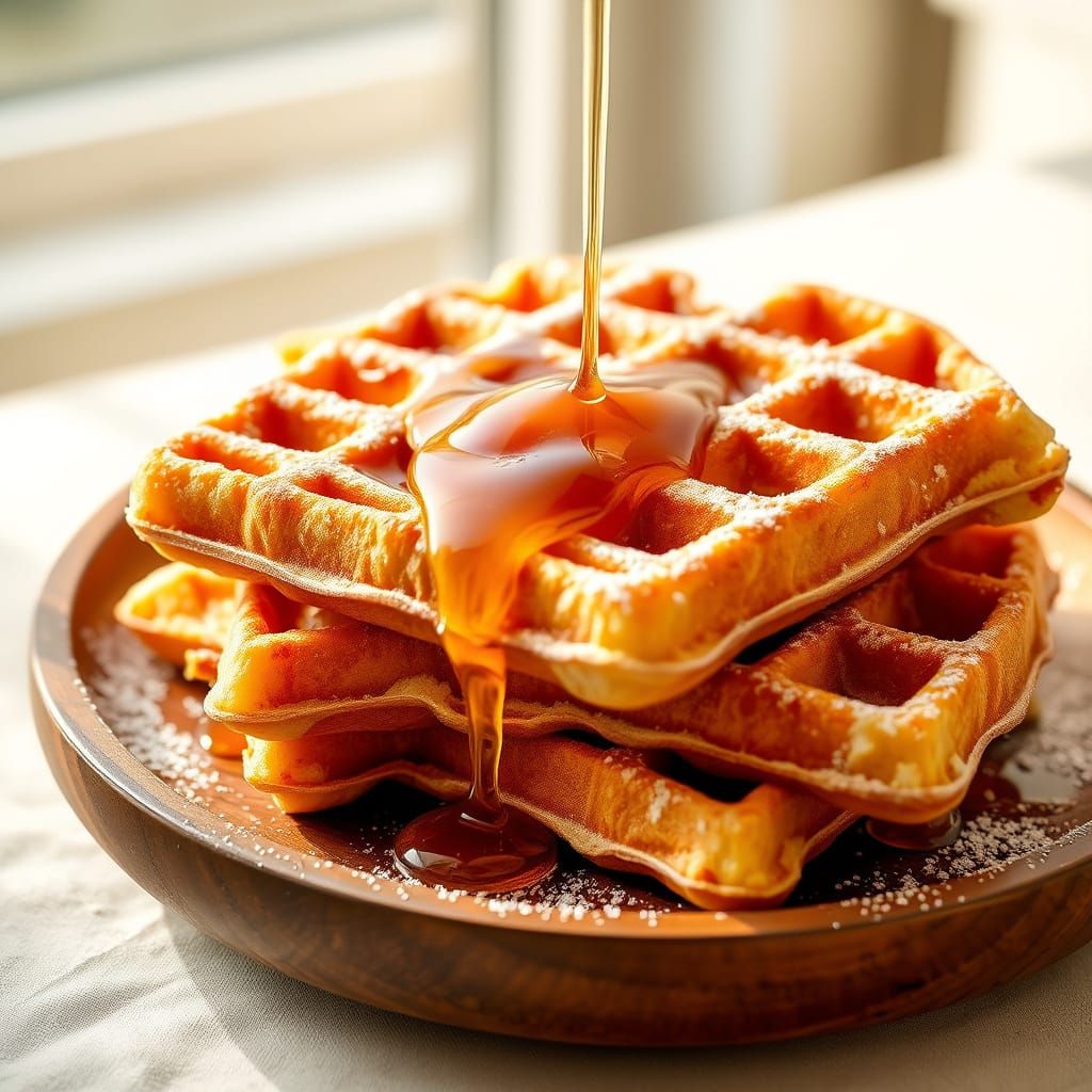 This mouthwatering image showcases crispy Vienna waffles with fluffy centers, drizzled with warm honey and powdered sugar, set against a soft background, with delicate syrup droplets and a shallow depth of field, capturing the textures and colors of a delicious breakfast in a rustic, artfully arranged st...