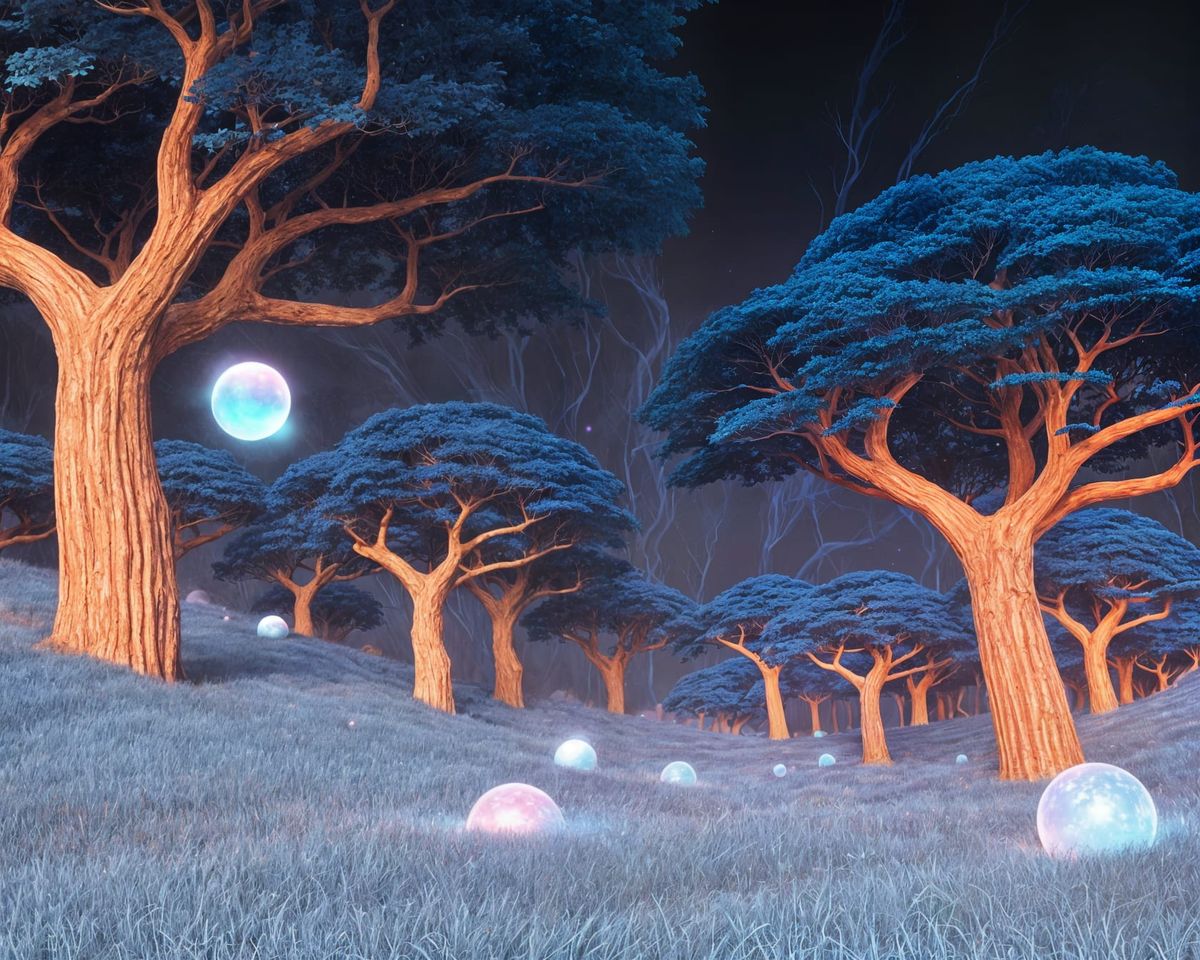 This image shows a panorama of a strange forest with orange bark and blue leaves. The digital illustration features hyperdetailed, cosmic, ethereal, and holographic elements with triadic colors.