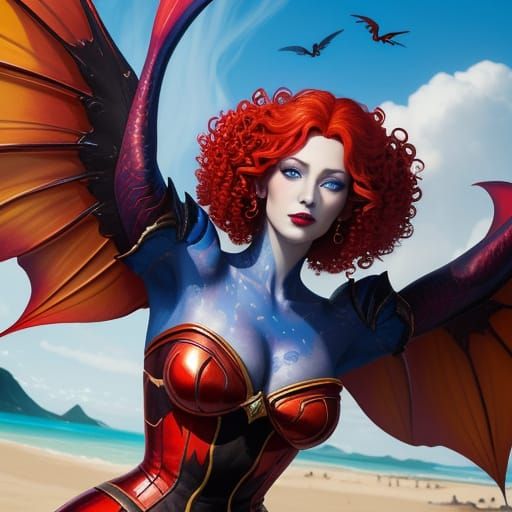 This image shows a stunning vampire character with vibrant red hair and galaxy-blue eyes, running on a beach with dreamy wings and fae features, set against a Salvador Dali-inspired melting oil painting backdrop.