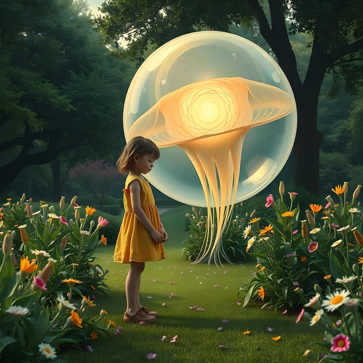 We see a sad little girl standing in a park next to her invisible friend Mr. Bag, whom we see as a giant euglena standing vertical at about the girl's height. In the style of Mark Ryden.