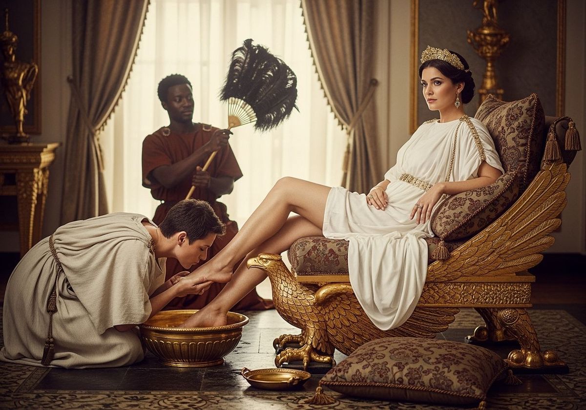 This image shows a Roman Empress relaxing in her private chamber. She is attended by servants in a scene filled with opulent gold ornaments, captured with sharp focus and subtle bokeh.