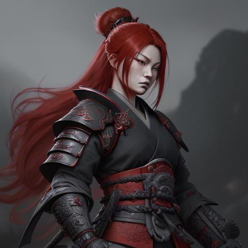 A detailed matte painting of a red-haired samurai warrior. The image features deep colors, intricate details, and complementary colors, rendered as fantasy concept art in 8k resolution.