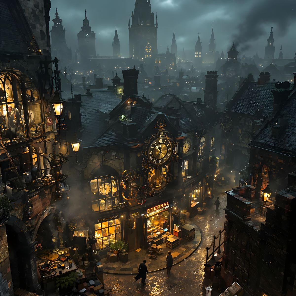 A captivating scene of a fog-laden alley in a Victorian city at midnight, filled with clockmakers' workshops. The image evokes a sense of mystery with its gothic architecture, flickering gaslamps and intricate mechanical details.