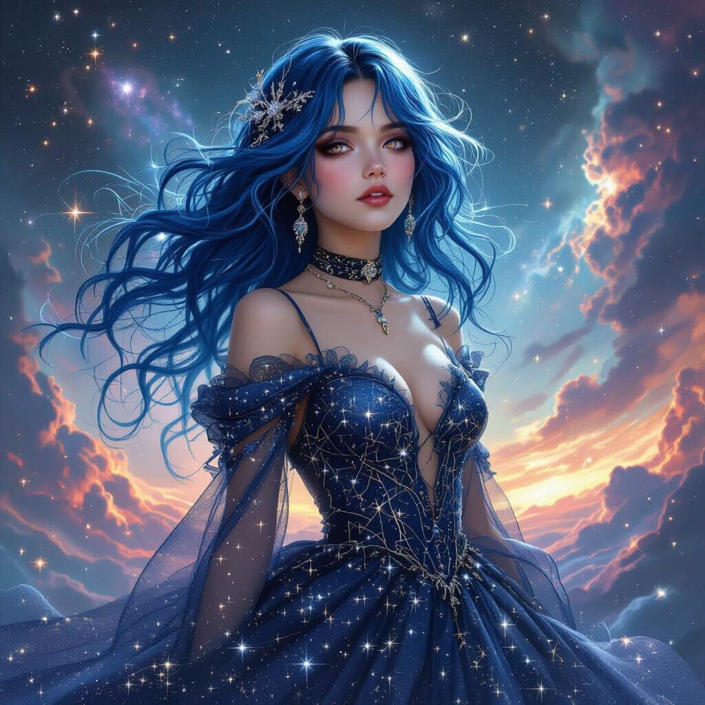 This image shows a gothic-punk college student transformed into a celestial being. She has electric blue hair flowing like stardust and wears a gown embroidered with constellations, set against a swirling nebula as hyperrealistic digital art.