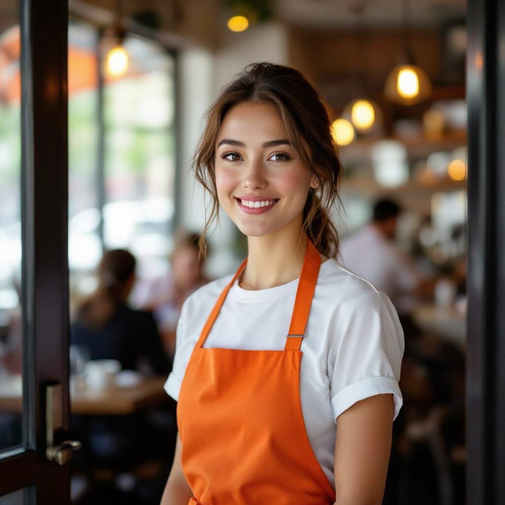 A photorealistic image shows a young woman in a white shirt and orange apron smiling at a restaurant entrance. The soft focus and warm style evoke a feeling of welcome.