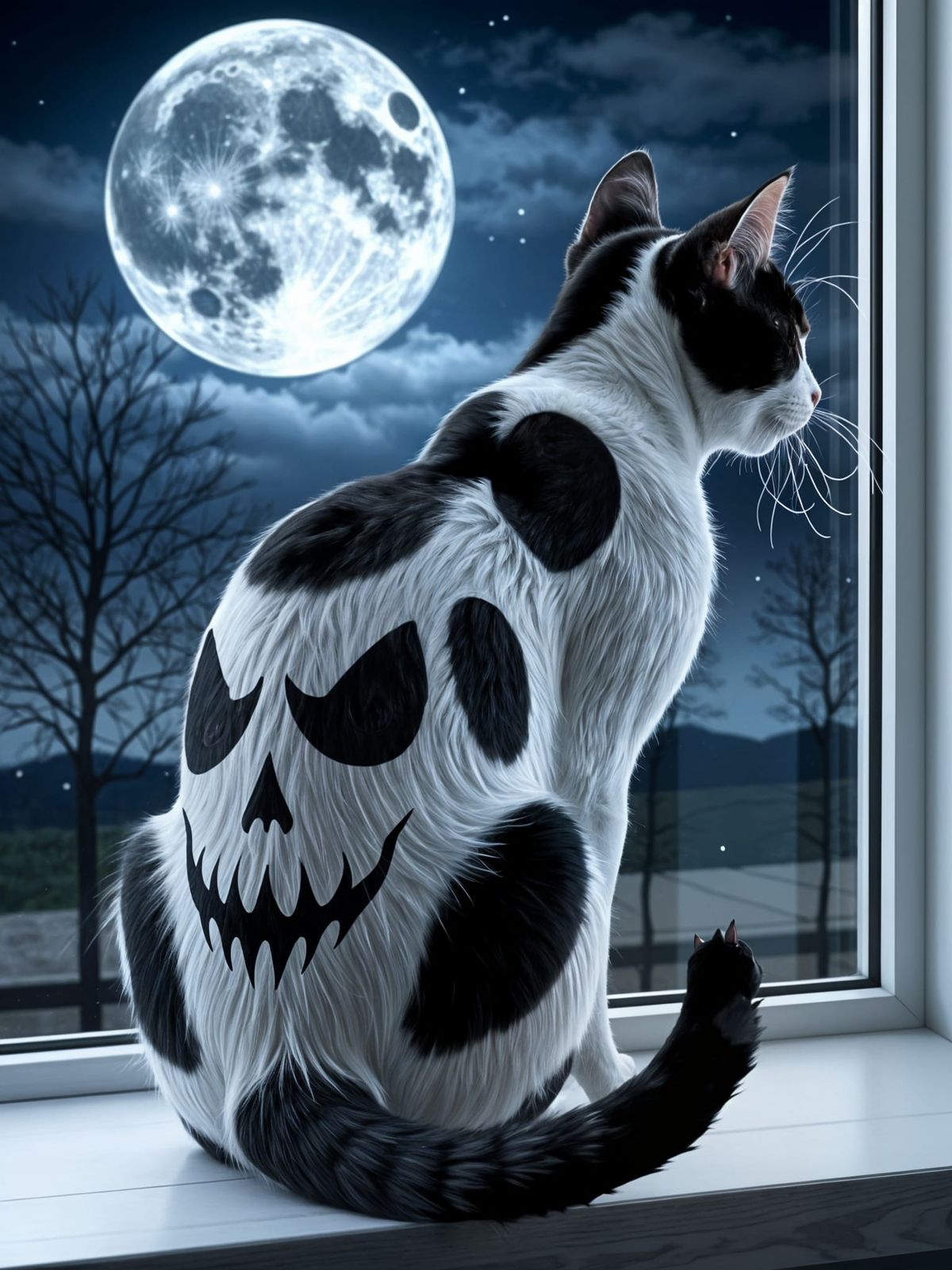 This image features a highly realistic black and white cat sitting in a windowsill, gazing up at the moon with a spooky face-like pattern on its back, captured in a striking silhouette.