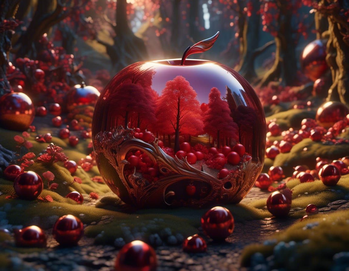 Ruby red apple shaped orb with glowing ember floats <lora:Fantasy Iridescence:1.0> into the dusk beckoning 7 dwarves in orbs to follow, get a bit of ember to save Snow White from Forever Sleep. #land #sea #air #forest #fairyland #Disney This is their quest deep color golden hour Cinema 4D fantastical fantasycore