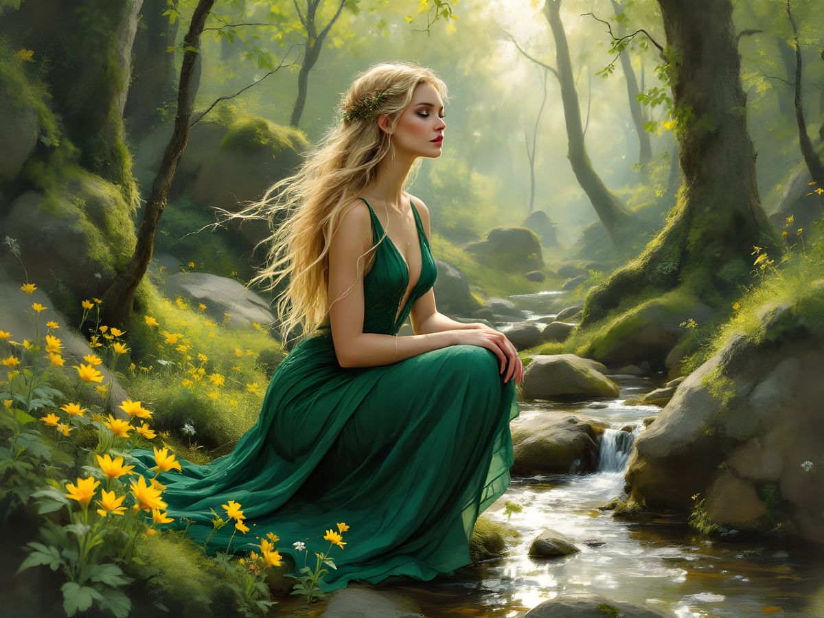This image depicts a blonde Norse goddess in an emerald gown, kneeling in a sunlit forest clearing with flowers. Rendered in a painterly oil blend with impressionistic light.