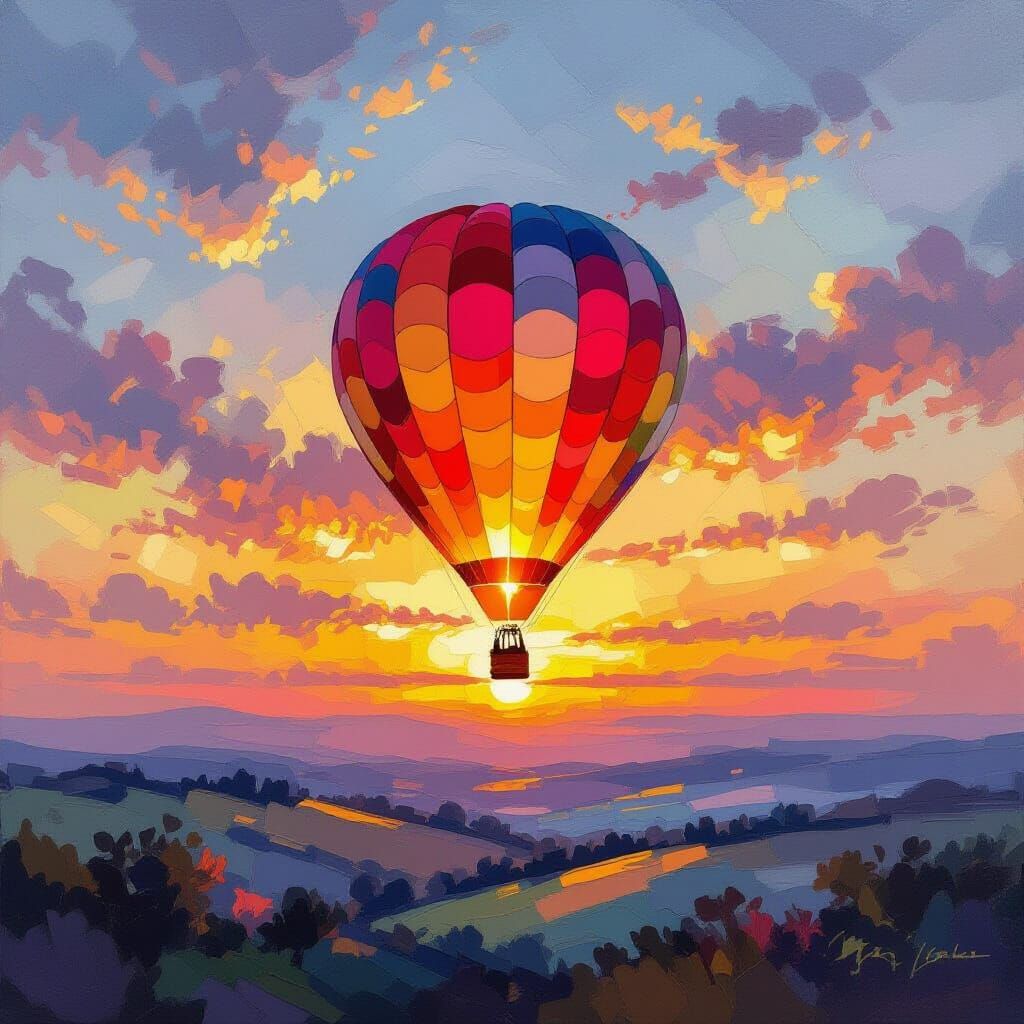 A vibrant sunset scene featuring a hot air balloon drifting above the horizon. The artwork evokes a sense of serene freedom through impressionistic painting techniques.