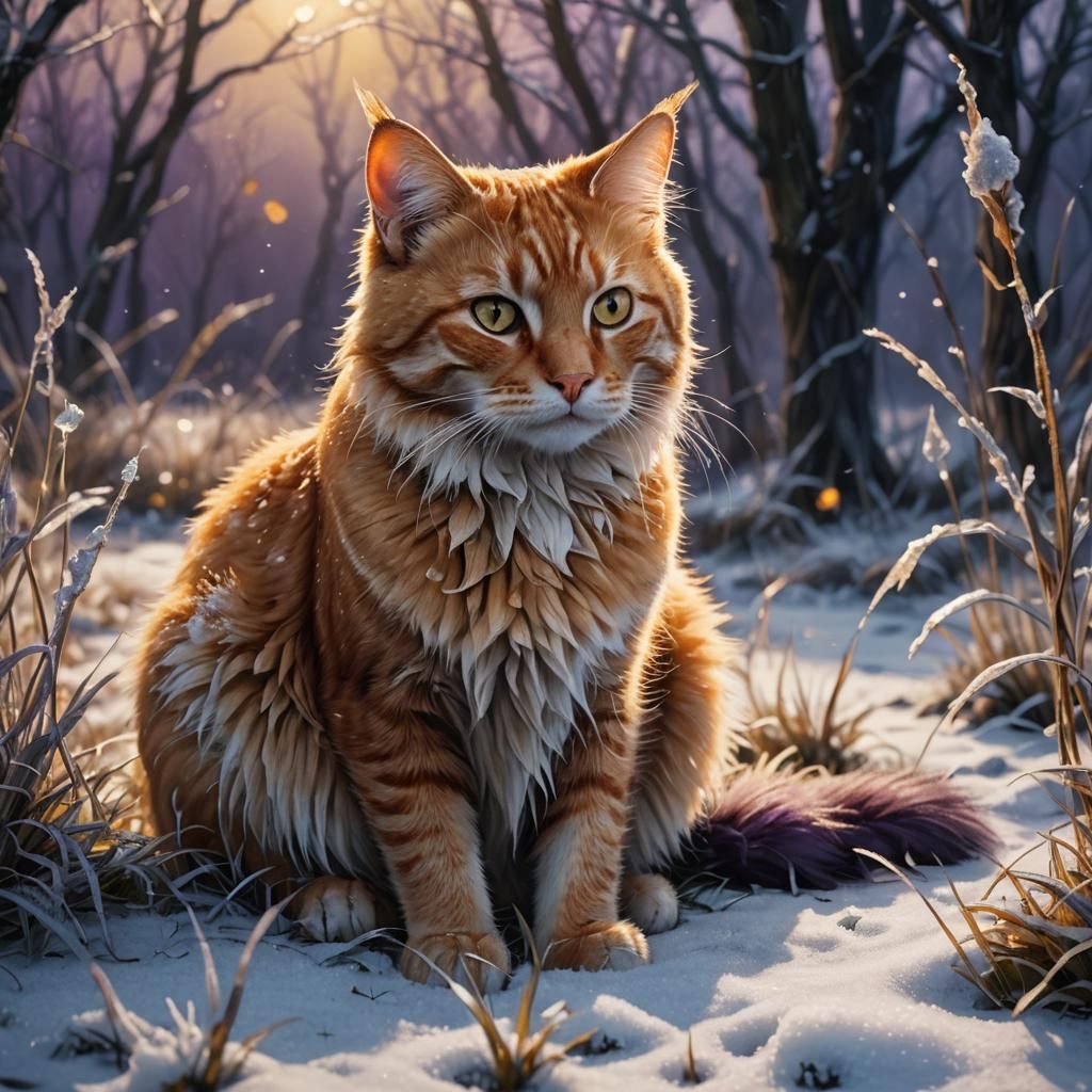 A striking picture of an orange tabby cat in a frozen winter landscape. The artwork features volumetric lighting, rich colors, and intricate details in a dark fantasy aesthetic.