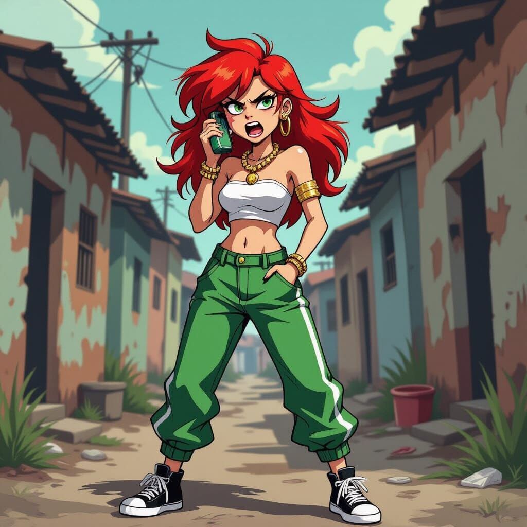 This image shows a red-haired young woman in a slum, looking unwell while yelling into an old cell phone. The art style is graphic and cartoonish, with bold lines and flat colors.