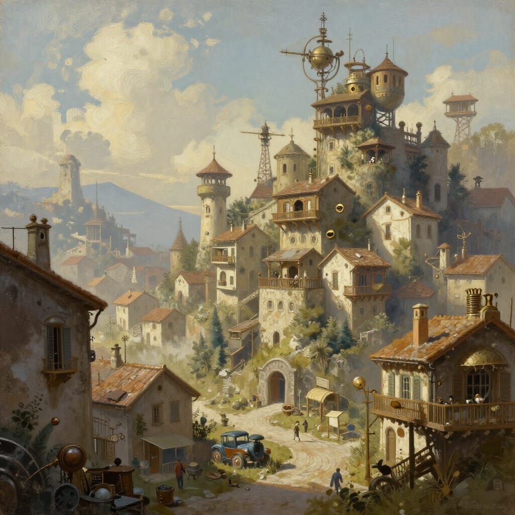 This image depicts a steampunk cityscape blending Italian and French architectural elements with futuristic designs, rendered with soft, painterly strokes.