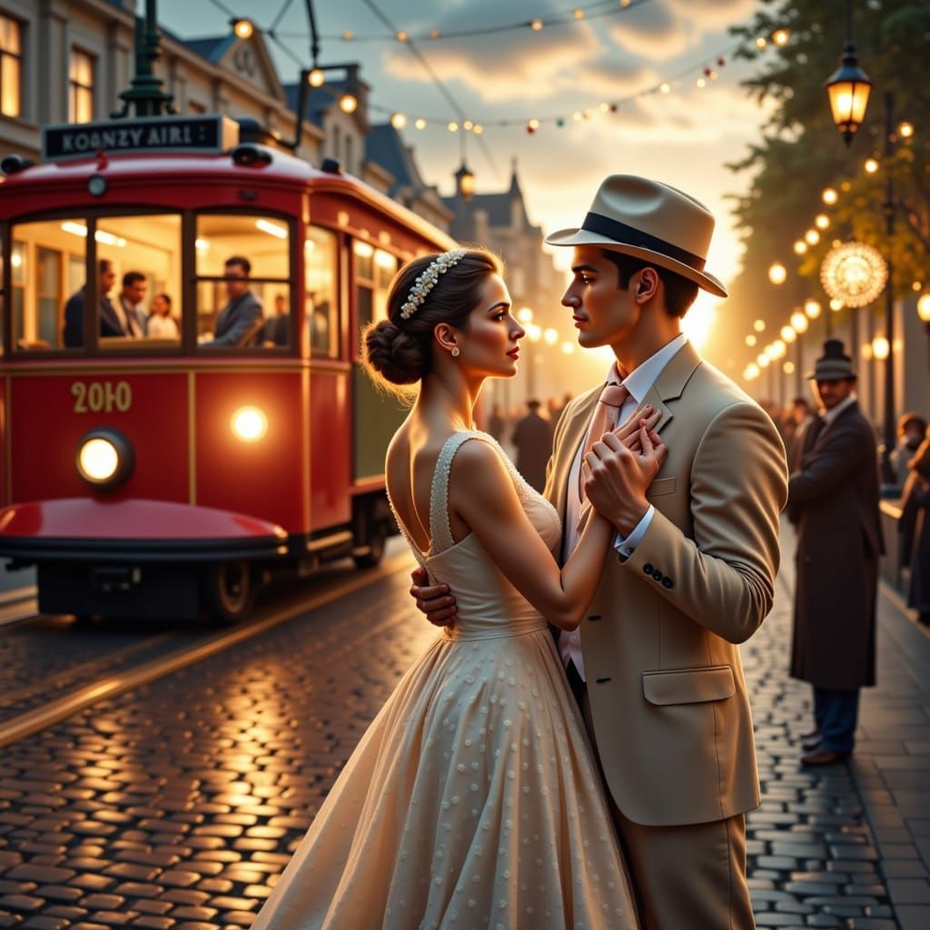 This image depicts a romantic 1940s musical poster featuring a couple dancing on a street with a vintage tram and glowing lanterns. The scene is rendered with warm, nostalgic colors.