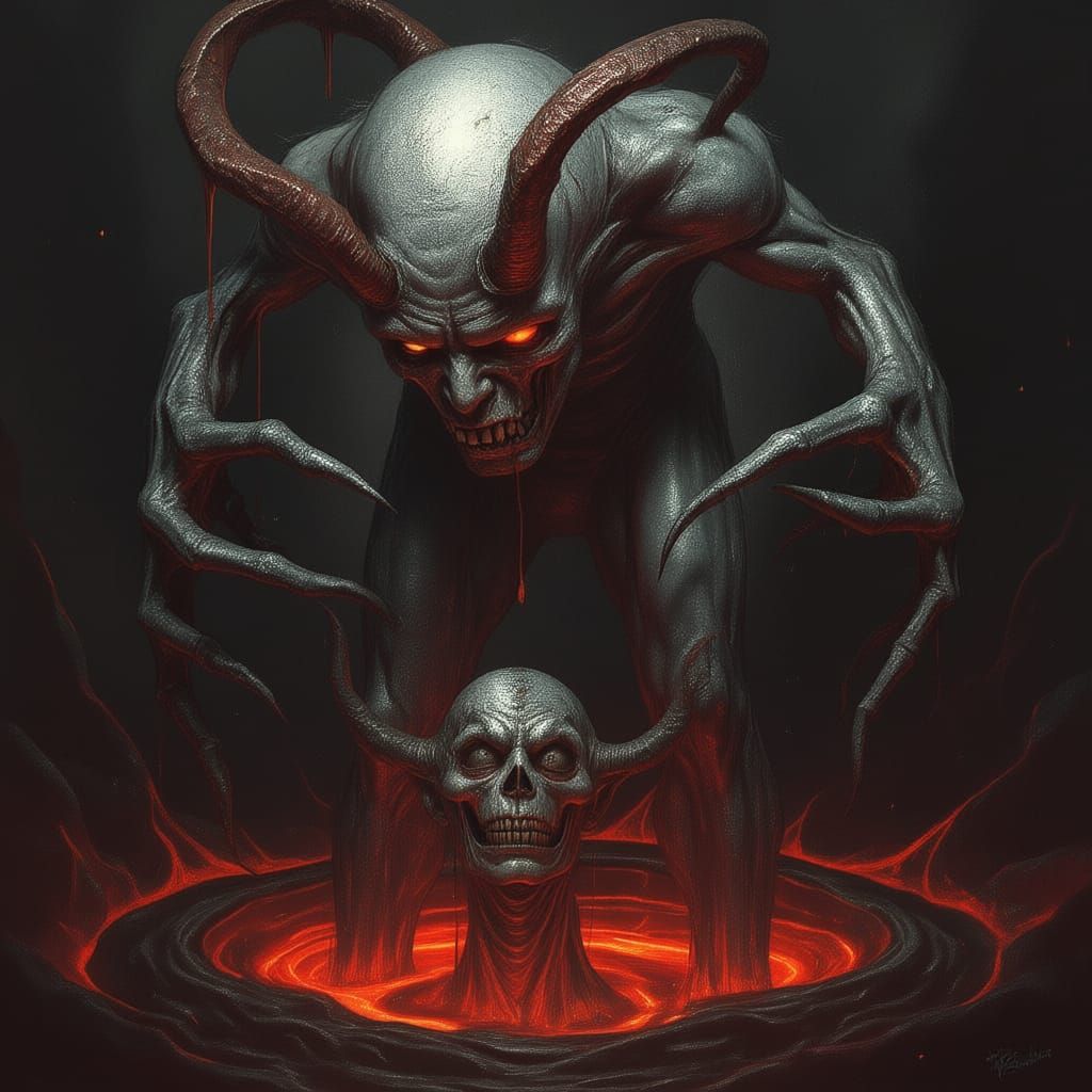 A horror-filled, maximalist atmosphere with figures in frost and a whirlpool pit. Rendered in a crimson, sepia, and quicksilver palette with elements of vanta black.