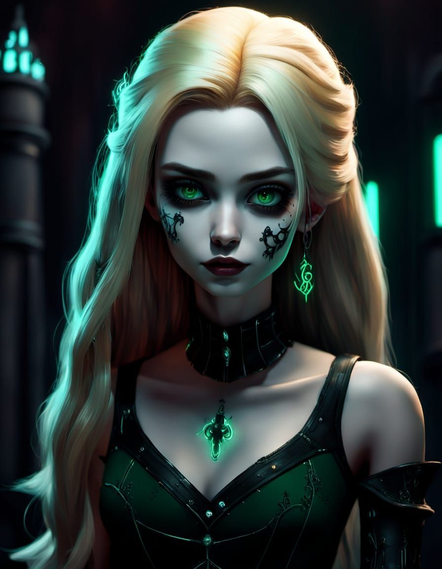 A digital painting of a goth character with blonde hair and green eyes, reminiscent of Sally, in a neon-lit cyberpunk city. Features include visible stitches and patchwork clothing.