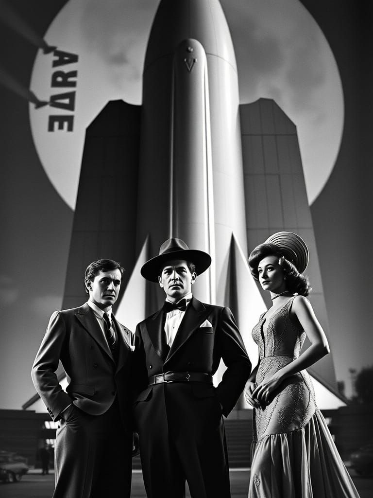 This image shows Rudolph Valentino, Gary Cooper, and Clara Bow in futuristic attire. They stand before a massive Art Deco rocket, rendered with a film noir aesthetic. The image evokes vintage sci-fi with dramatic lighting.