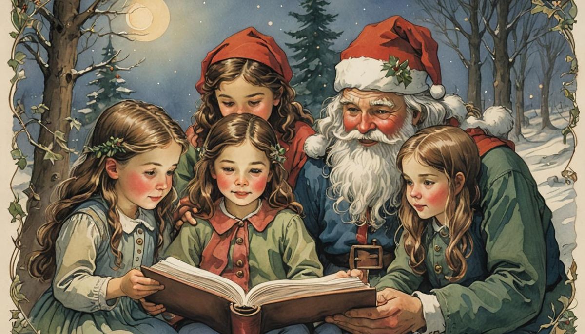 A charming image shows Santa Claus reading with children, their faces lit by the book's glow. The artwork evokes classic illustration with delicate linework and a focus on naturalistic details.