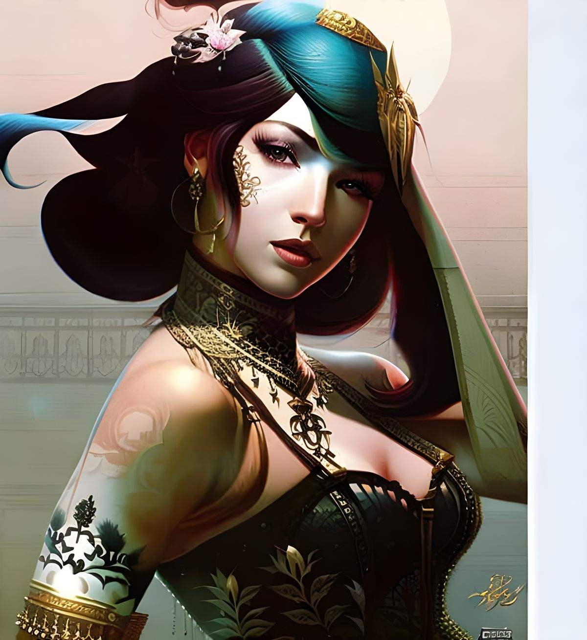 Photo-realism HDR portrait, insanely detailed closeup of gorgeous Jasmine Aladdin, “by Ismail Inceoglu, Atsuko Goto, Tom Bagshaw, Kelsey Beckett”, fantasy biopunk cyberpunk gritty and rust colors, tertiary Color, 8k resolution concept art, Natural Lighting, Beautiful Composition, bokeh, canon lens, ...