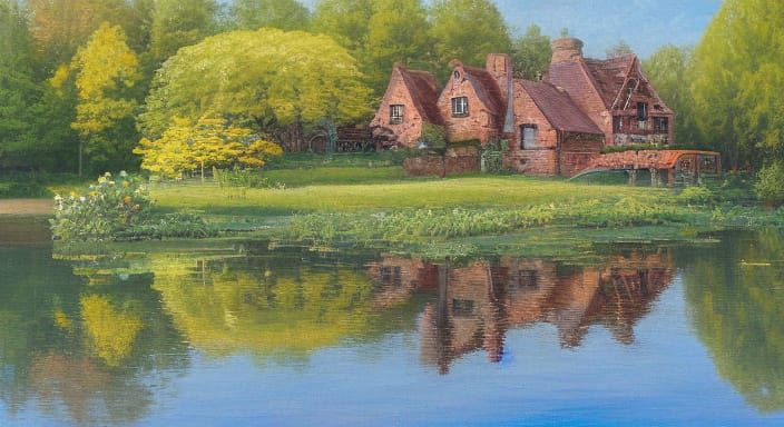 This oil painting captures a picturesque half-timbered cottage beside a calm pond, featuring a blooming cherry blossom tree and lush garden, rendered with thick impasto brushstrokes and rich colors in a classical landscape style.