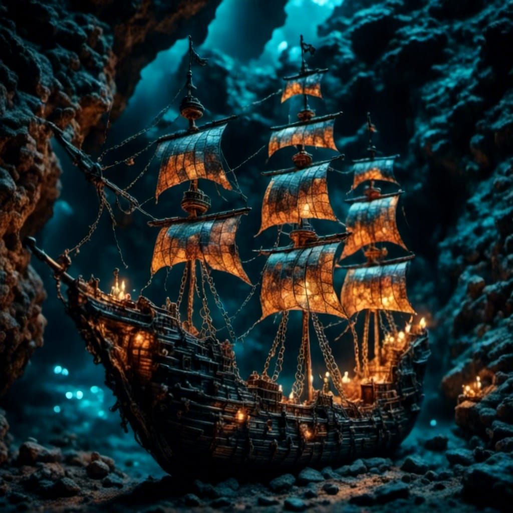 This image shows an old pirate ship mysteriously trapped inside a cave, rendered in hyperrealistic detail. The scene has a surreal, dreamlike quality with dramatic lighting.