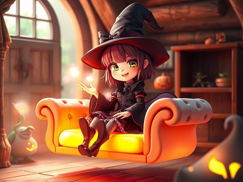 This image shows a cheerful witch in gothic clothes levitating a luminous sofa within her cottage, rendered in a 3D anime art style with dynamic lighting and fine textures.