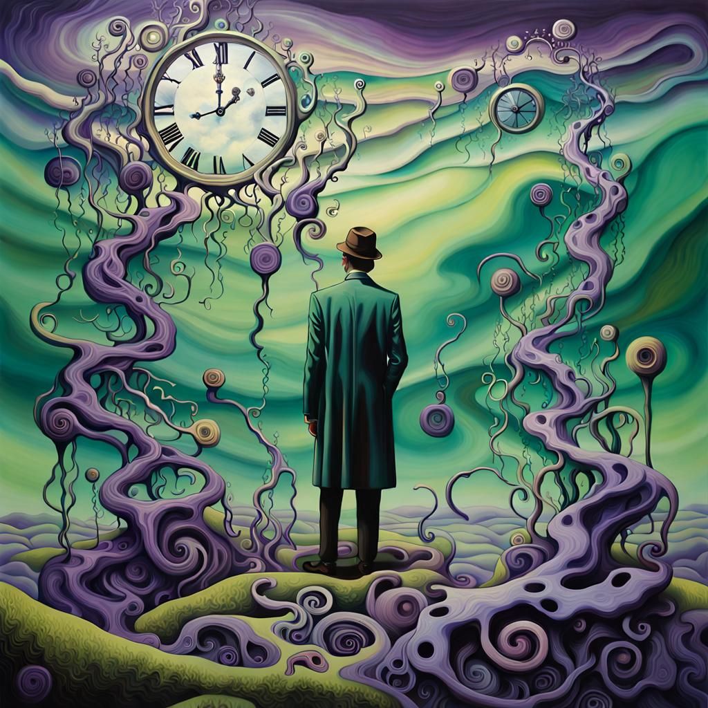 A surreal image of a figure amidst melting clocks and vines in a dreamscape. The artwork features swirling purple and green clouds with floating clockwork, rendered with rich shadows in an oil painting style.