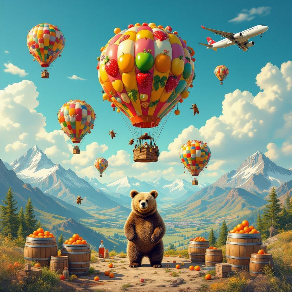This highly detailed digital artwork depicts a surreal landscape with fruit and candy patterned hot air balloons. A bear stands among barrels and oranges, with tiny bears floating skyward. Inspired by surrealist masters.
