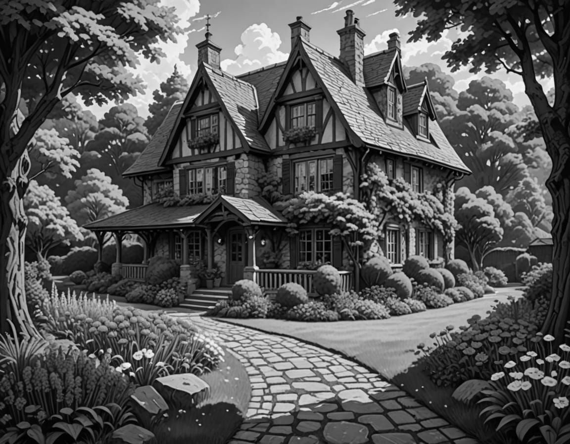 This image showcases a serene and picturesque scene of a weathered stone summer house surrounded by a lush garden, featuring detailed line work and high contrast ink illustration in a timeless, legendary style.