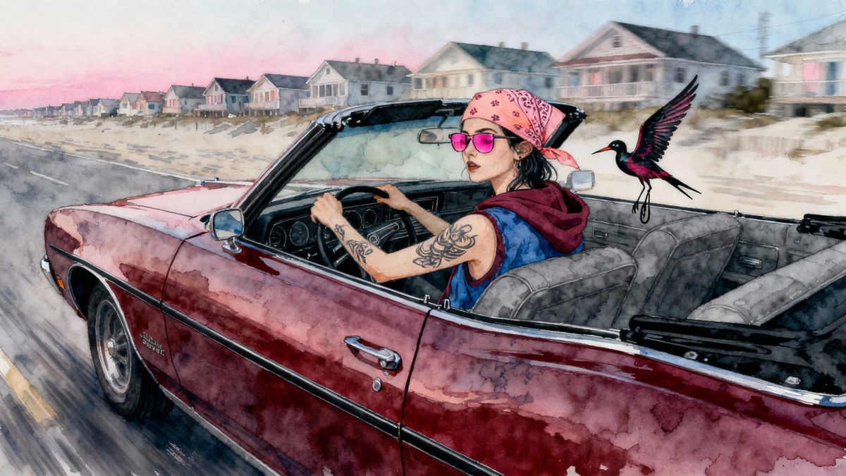 A John Blanche style side-profile watercolour of a young woman (5' 8" tall; coral-pattern salmon-pink/rose bandana; indigo/maroon sleeveless hoodie; black/burgundy heron tattoos; pink lens sunglasses) driving a 1968 Pontiac convertible (burgundy paint with black trim and grey upholstery). Her left arm ...