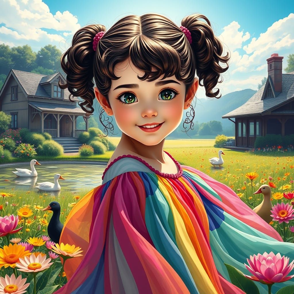 A vibrant portrait of a brunette girl with curly pigtails, wearing a colorful rainbow dress, set amidst a serene country scene with a rustic house, pond, and playful ducks amidst water lilies, rendered in a dynamic, Art Nouveau-inspired style.