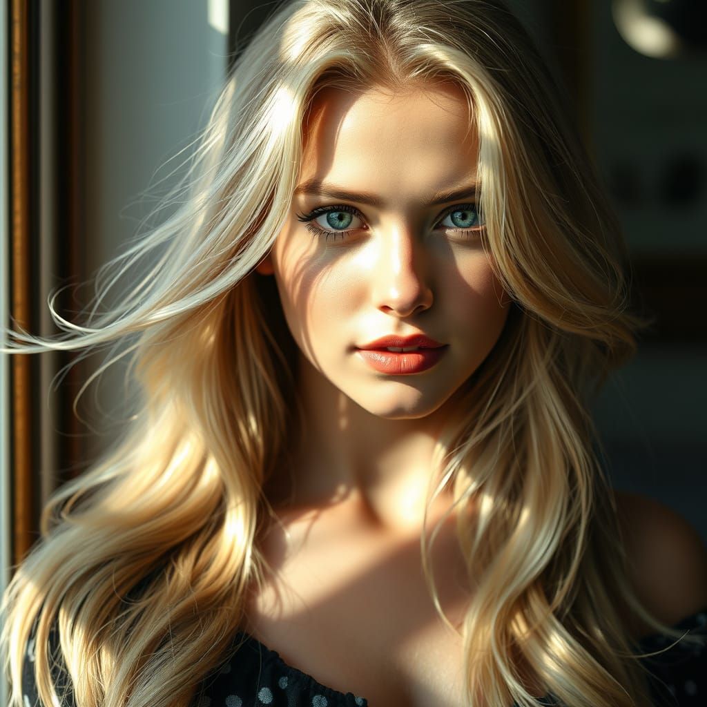 This image shows a beautiful blonde woman with long, golden hair, illuminated by soft window light. It's a hyperdetailed portrait with dynamic lighting and volumetric effects, created in a digital art style.