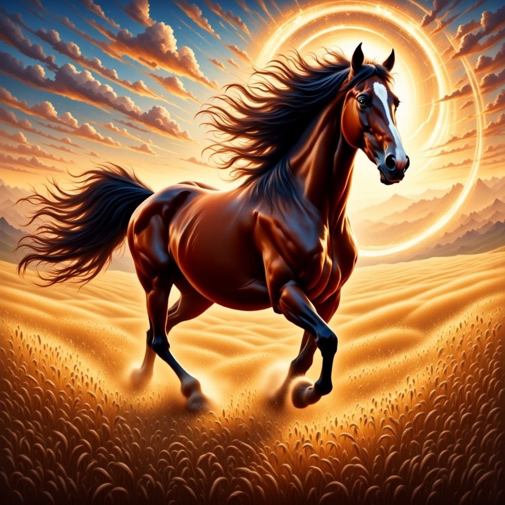 A magical horse gallops through a golden wheat field, its mane flowing in the wind. This digital acrylic artwork features realistic colors and warm lighting, with a swirling vortex of light surrounding the powerful animal.