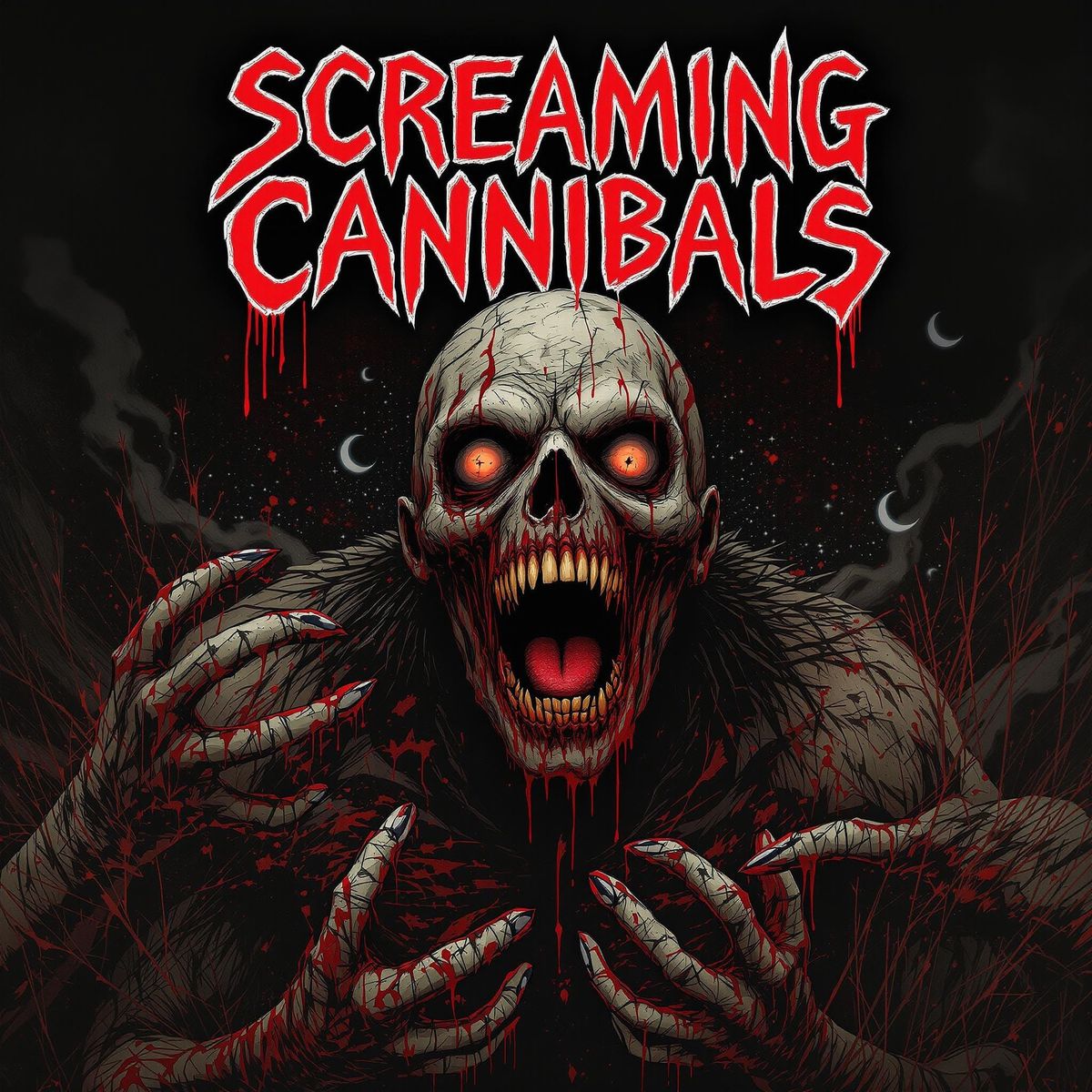 This image shows a zombie heavy metal band album cover. The cover features horror-themed text reading "SCREAMING CANNIBALS".