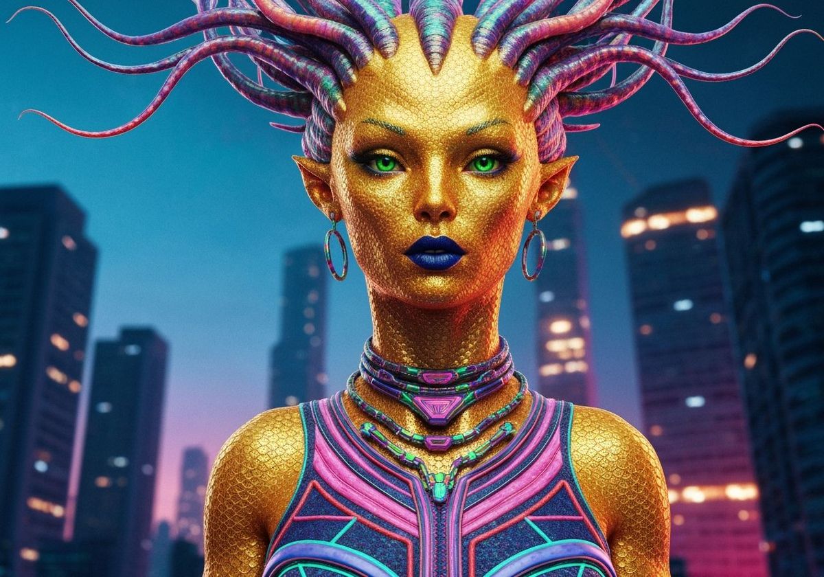 This image features a sleek alien woman with golden, fish-scaled skin, blue lips, and green feline eyes. She wears detailed clothing and jewelry with colorful tentacles flowing from her head, set against a futuristic synthwave city.