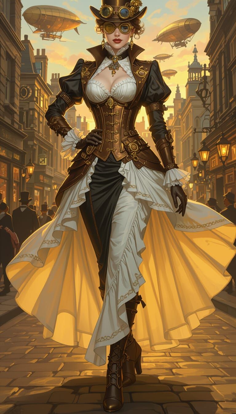 A woman in a detailed steampunk outfit stands on a Victorian street with dirigibles. The digital art features golden hour lighting and vivid colors.